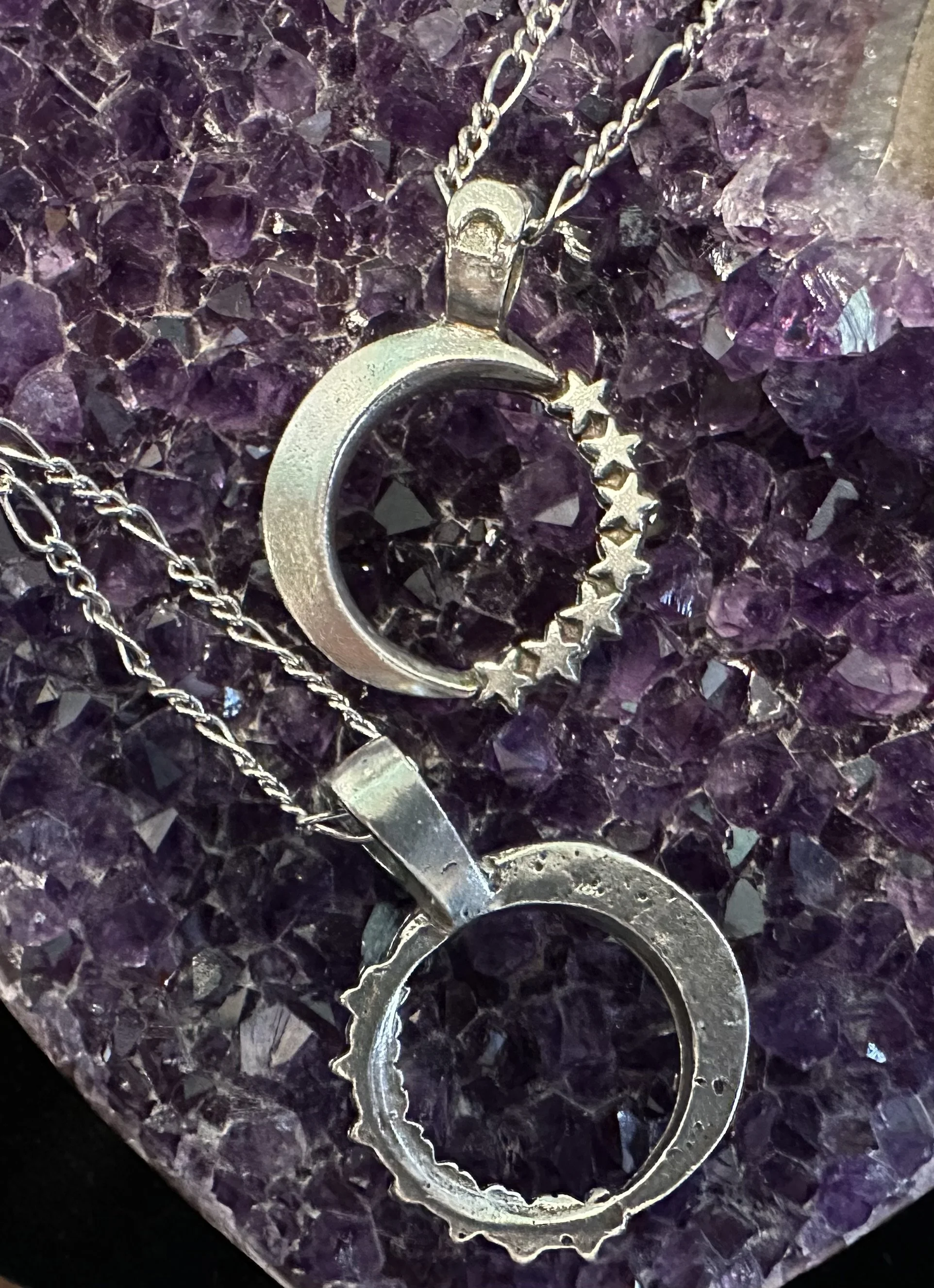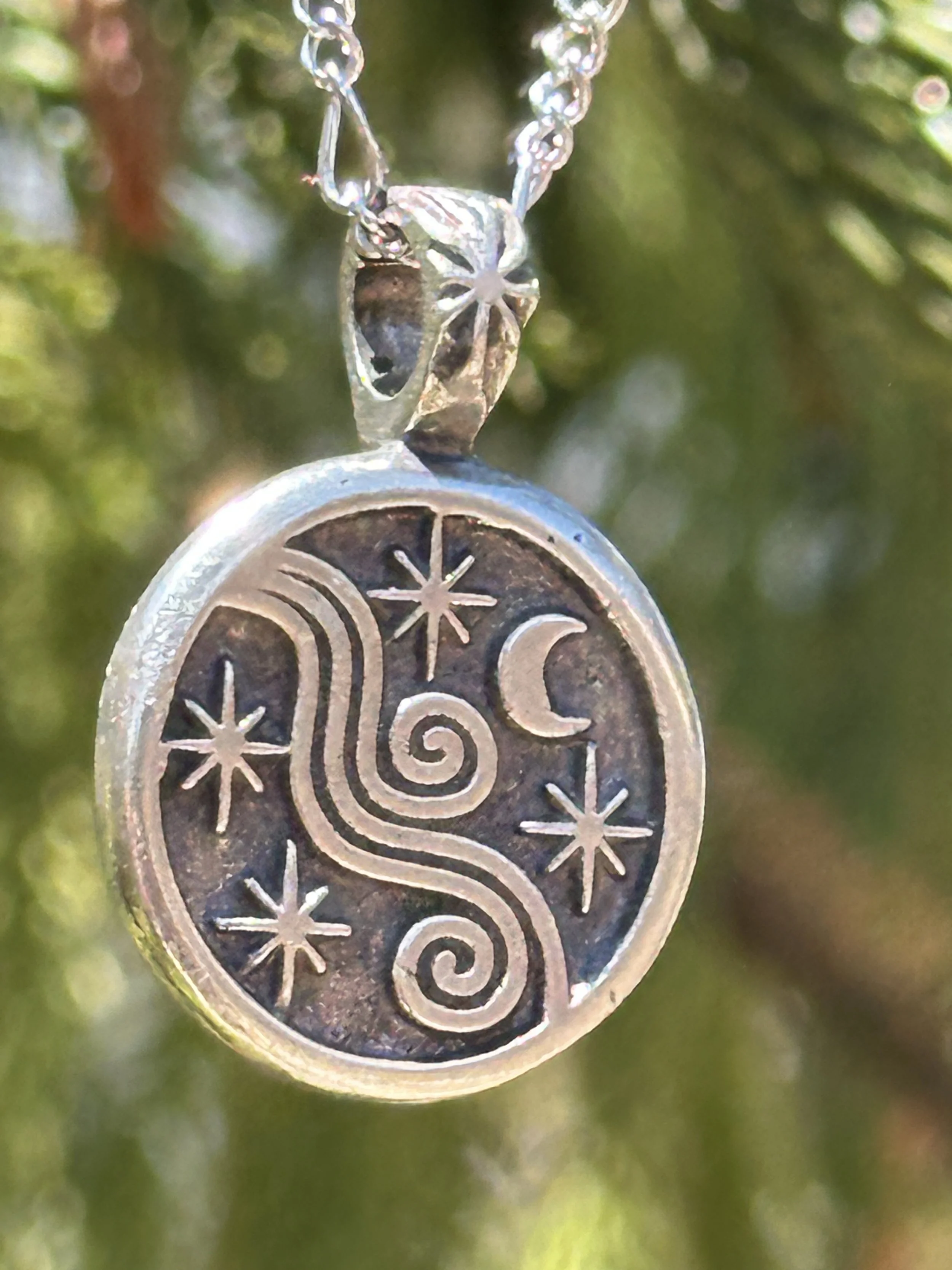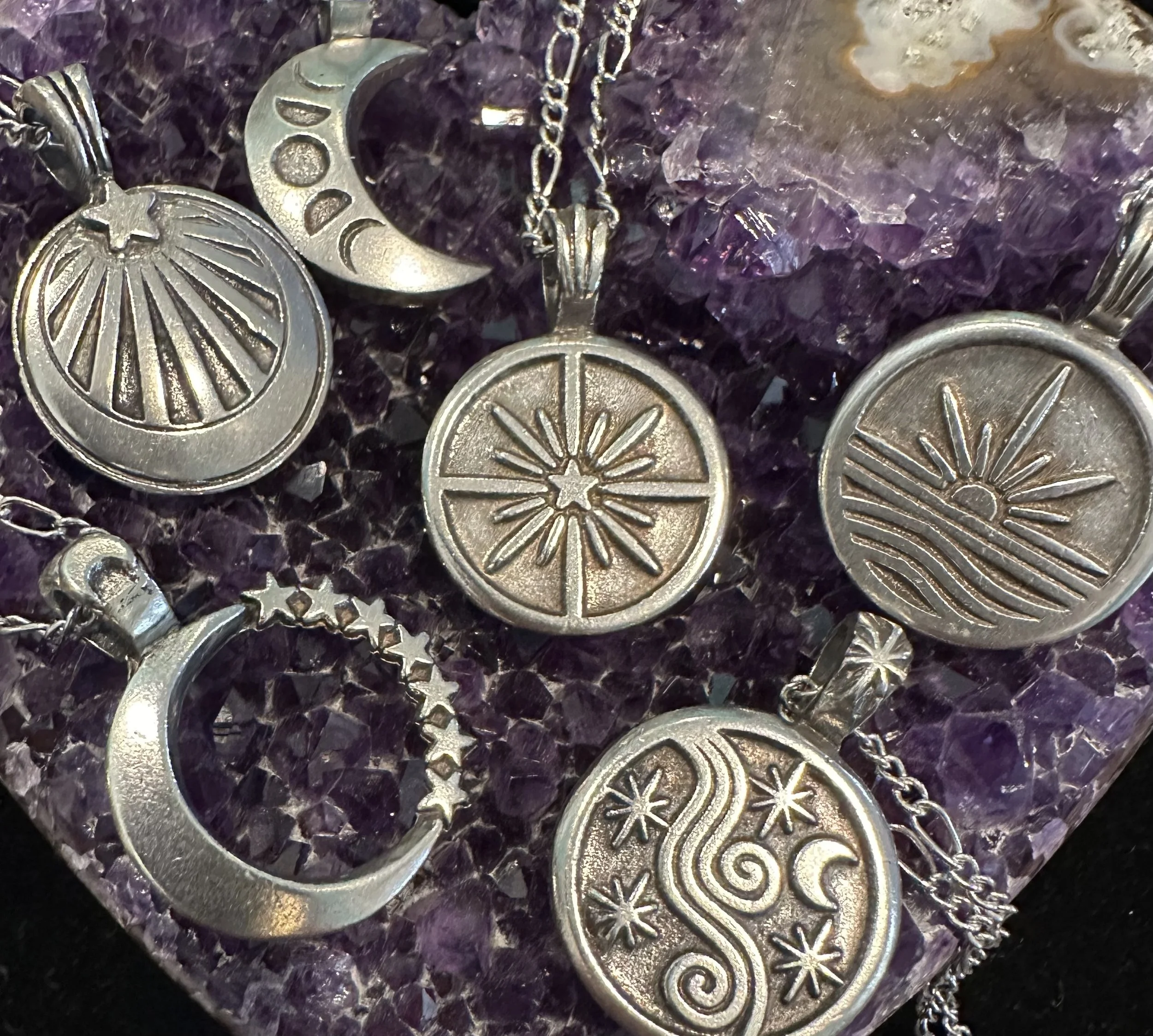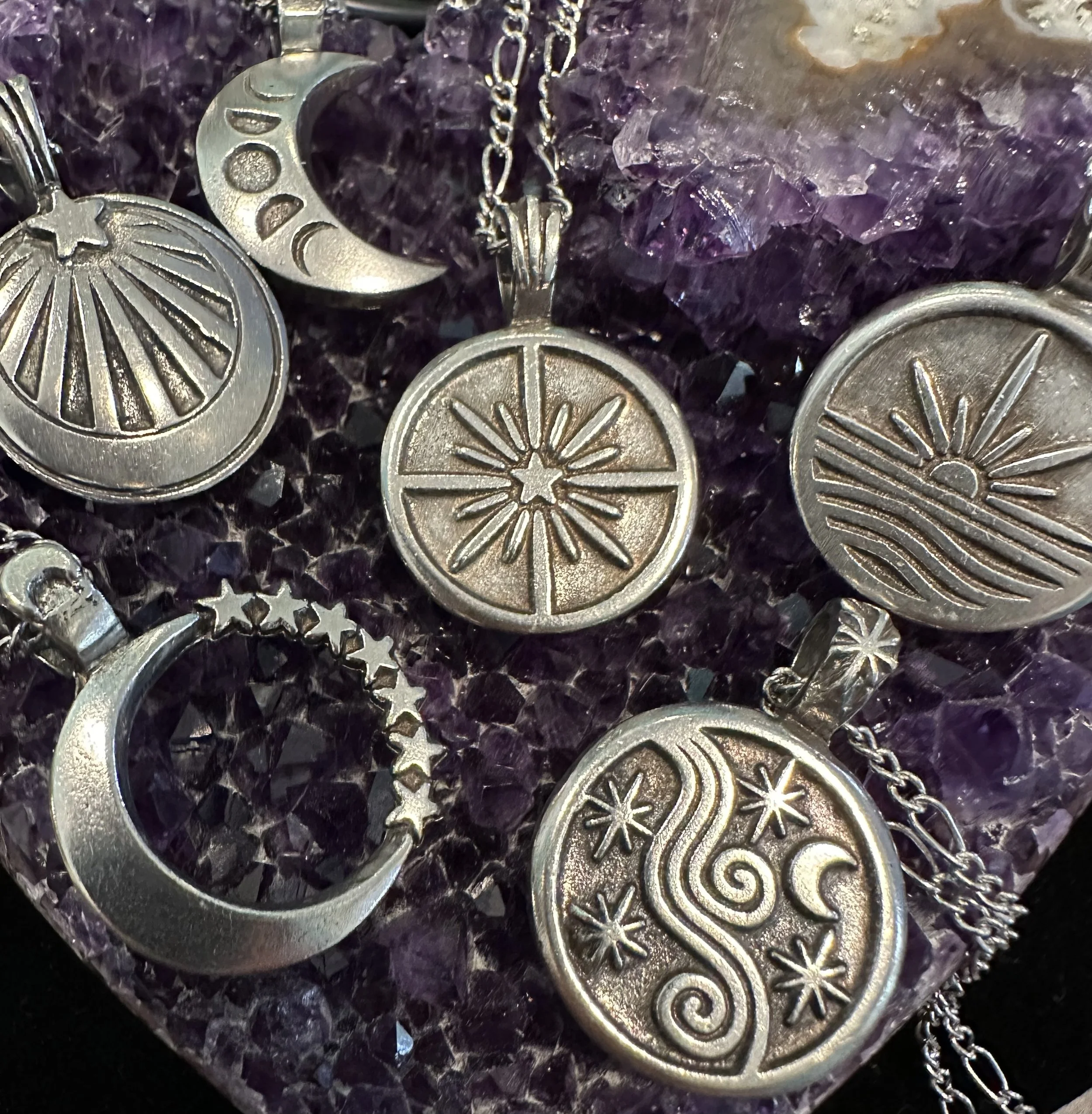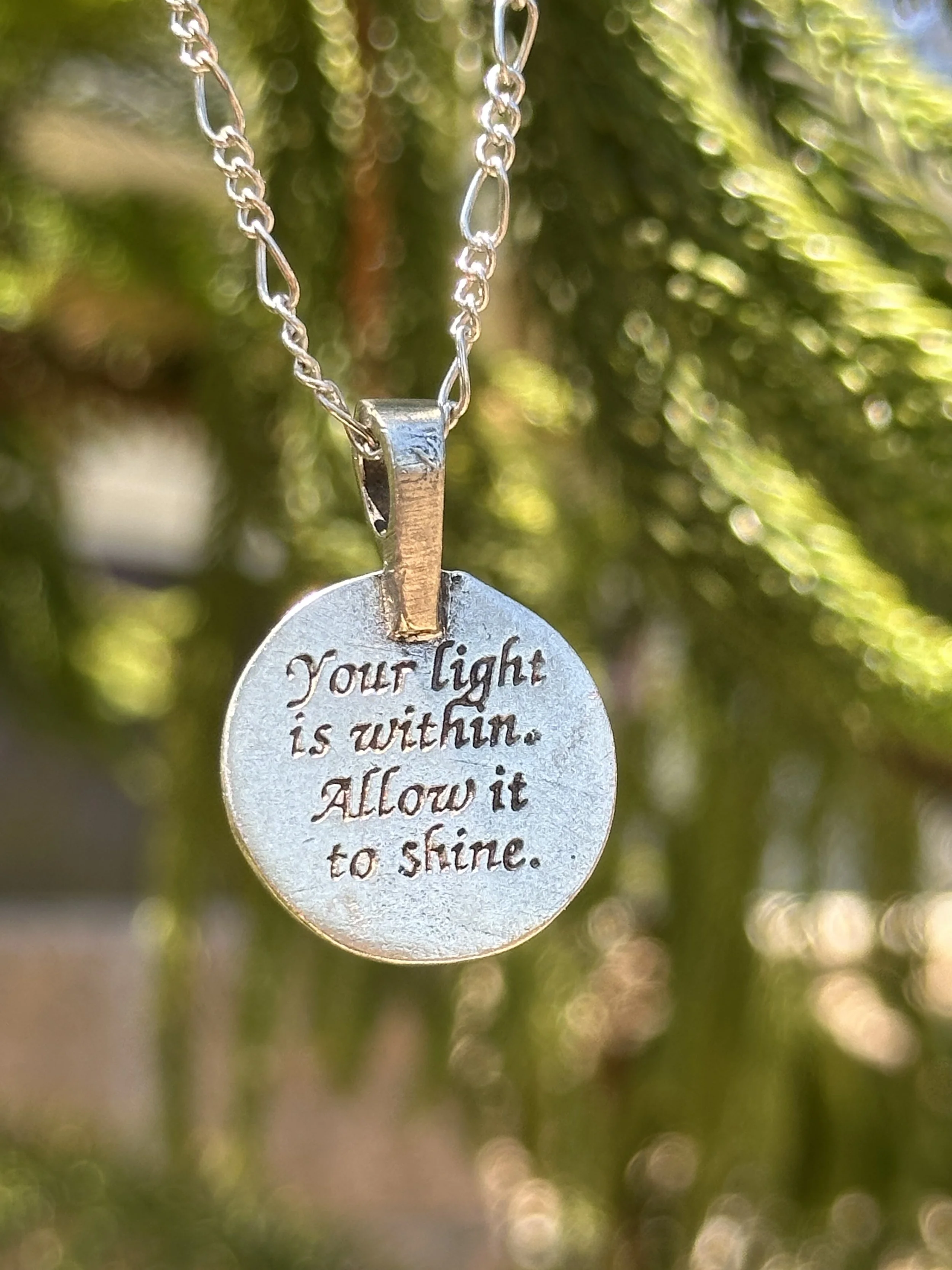 These striking Celestial pendants will light your path and remind you that you are light and love. The necklaces are handcrafted in the USA of fine, lead-free pewter. Each pendant varies in size from approximately .8” inches and 1.25” long, and comes with an 18” figaro steel chain with a lobster claw clasp. There are 6 designs, 5 of which have powerful inscriptions on the back.