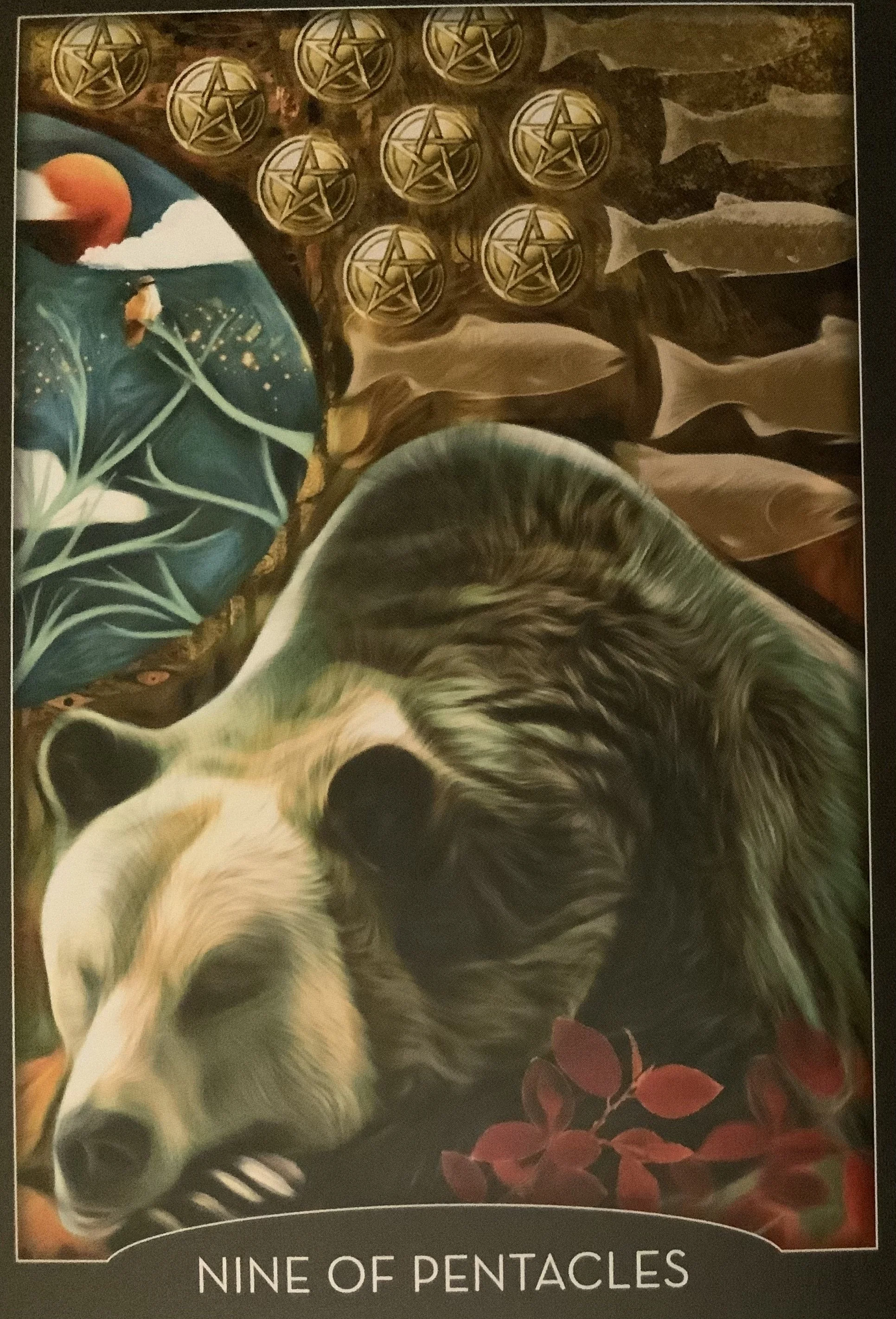 In this deck, Bear Spirit is included on the 9 of Pentacles. Bear Spirit carries powerful medicine and teaches us beingness. Bear Spirit also assists us in finding our natural rhythms in this world amongst all the current noise. Bear Spirit further supports us in feeling our own strength and tapping into our inner guidance, particularly through our dreams. As such, Bear Spirit brings forth deep healing energies that cultivate our sense of balance, inner peace, and wholeness.