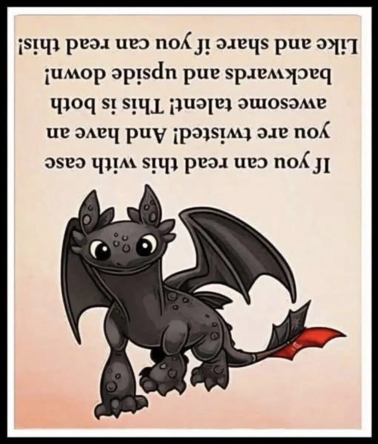 This post brought forth such joy. I am enamored with Toothless from the “How to Train Your Dragon” movies that this dragon reminds me of. And, I found, unexpectedly, that I could easily read this and didn’t realize that it was upside down or backwards at first. What a surprise! 😆 I had no idea, nor do I know how I will use this 🤣 but I was grateful for the giggle nonetheless. 🙏💖